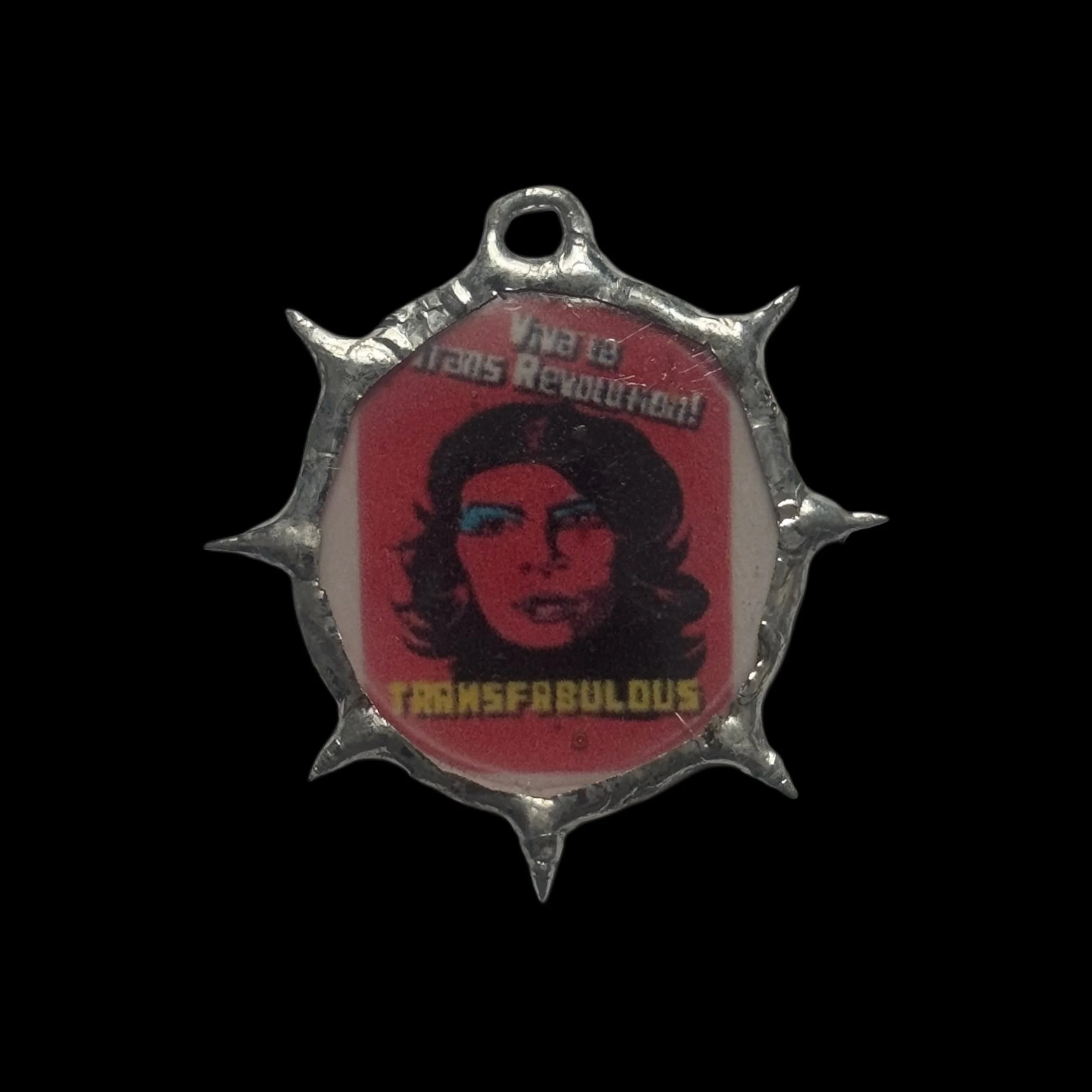 Handcrafted lead-free soft soldered spiked ‘Viva La Trans Revolution! Transfabulous’ pendant. Spikes have been sanded down but, please be gentle when handling. Pendant is 1.75 inches tall and 1.5” wide.